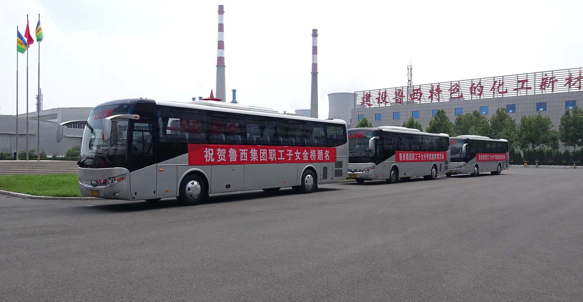 职工子女升学奖励参观活动”条幅的三辆通勤客车,分别在聊城滨河小区、英才小区以及东阿厂区门口迎接金榜题名的学子们。2018年参加高考的150余名优秀学子及家长参加活动。