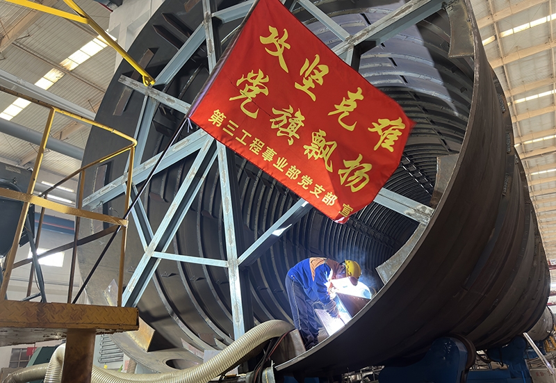40万吨/年有机硅项目的建设施工正在紧张有序进行中,二元塔作为项目的核心设备进入了制作的关键期,该设备共有三台,单台高度90m,直径6.6m,重量达1000吨,且设备内部结构复杂,焊接工作量大。由于设备体积大,无法在厂房内完成整体制作,为保证设备制作质量,充分考虑后期运输安装等因素,技术部门反复研讨论证,首次采用了“车间预制+现场组焊”的方式进行大型高塔设备制作。基层党支部抽调精干力量,成立党员突击队,一部分在车间加班加点对二元塔预制,另一部分到项目现场进行设备底部裙座环缝合口焊接、外口焊接等工作。广大党员克服战高温斗酷暑,认真落实各项安全措施和质量管控要求,为设备制作保质保量按期完成奠定了基础。