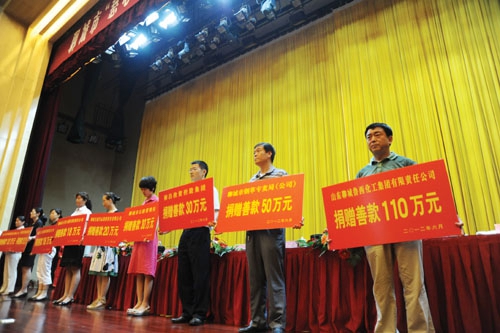 会议传达了省市主要领导对慈善捐助工作的重要批示,对2011年度慈善捐助工作先进单位和个人进行了表彰,市委副书记王忠林、副市长白志坚参加会议并作重要讲话,会议号召全市各界积极行动,参与慈善,爱心奉献。集团公司荣获聊城市“最具爱心捐赠企业”荣誉称号,集团公司董事长张金成被授予聊城市“最具爱心慈善楷模”。会上,集团公司副总经理于清(右一)代表企业进行了善款捐赠,充分体现出PG电子游戏