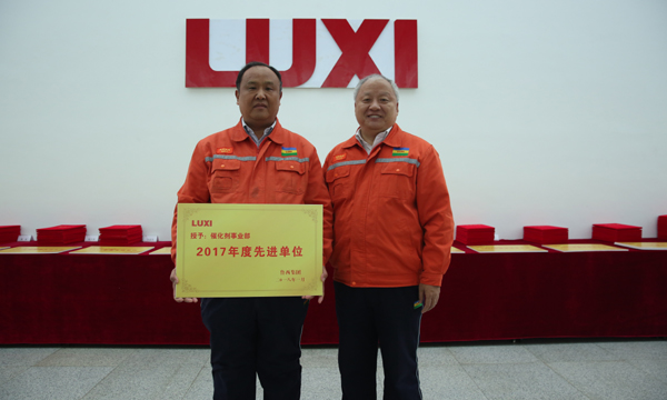 图为董事长为先进单位催化剂事业部颁奖。
