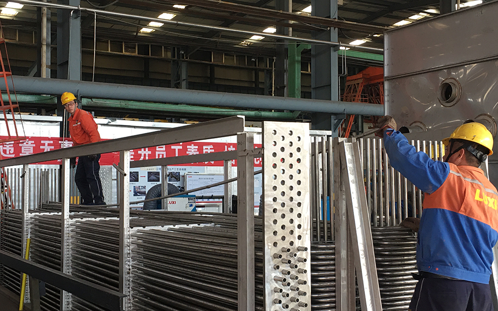 走进第一工程事业部设备制作厂房,陈兴勋主任正在现场指导蒸发冷管束组对工作,他告诉记者:“公司接到制作循环水蒸发冷的制作任务后,与技术人员进行辨识,制作循环水蒸发冷管束可以利用自行拆解与其他单位拆解退库的Φ25不锈钢管,将不锈钢管进行内、外抛光两道工序,确保换热管见金属光泽、表面清洁、无污垢后进行打压试验,挑选合格的管子进行齐口、截取、拼接、焊接成所需要的长度,利用校直机进行校直,再利用弯管机进行弯制蒸发冷所需长度的盘管,打压合格后利用到循环水蒸发冷设备的制作中。”