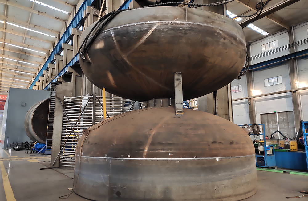 在设备加工技术创新方面,制造与工程事业集团技术人员努力攻关,自制工装模具配合4000T 压力机设备突破了容器膨胀节压制技术瓶颈,实现容器膨胀节自制,同时对大直径分瓣锥节组装方式优化,节约了成本,保证了项目设备需求。项目所需风管的组对制作,原工艺流程包括设备支腿焊接、叶片开孔按图纸逐台进行划线定位、焊接、开孔,工作效率较低。技术人员摸索试验了新的位置定位方式,使用模板对支腿、挡板位置进行划线,工作效率提高了3 倍。