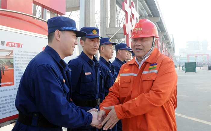 在一号门岗,领导亲切的和保卫人员握手拜年,并强调:门岗既是守护企业的关键岗位,又是体现企业高质量服务水平的窗口,在疫情防控常态化的形势下,既要做到严格管控,又要做到温暖贴心服务。