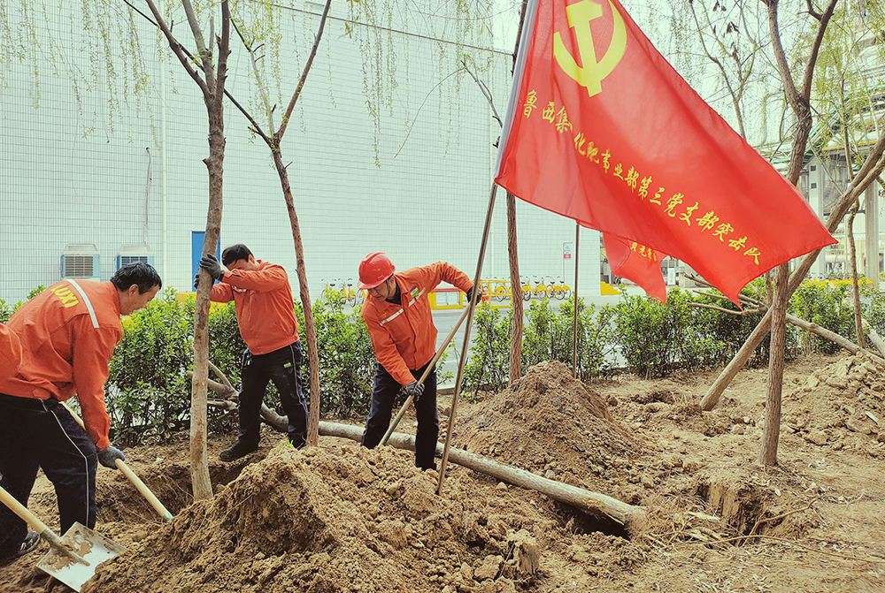 化肥事业部第三党支部协同化肥团支部全体党员、团员,共同开展“每人一棵树,建美丽园区”特色活动。广大党员干部积极发挥引领示范作用,与广大团员群众一起对园区进行绿化植