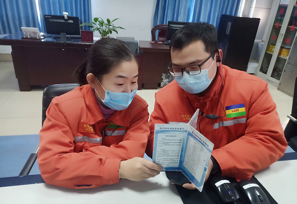 摘要:近日,在氯化苄事业部每个DCS岗位操作台的一角都规整的摆放着一个类似相框的旋转摆台。调度庞玉奇正在向操作人员介绍着这个旋转摆台,“这就是咱们氯化钙操作岗位的‘一岗三卡’摆台,它分为三面,是可以旋转查看的。三卡包含岗位物料MSDS卡、应急处置卡和安全风险卡。岗位物