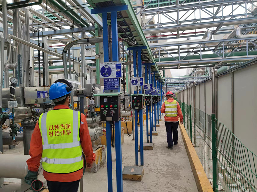 多元醇事业部进一步深入开展“黄马甲”管理活动,充分发挥领导示范作用,实施“部长、总监、责任单位负责人”三级人员穿甲引领示范,着“黄马甲”深入现场查找不安全行为和安全隐患,传授督察应知应会专业知识,做好安全第一吹哨人。
