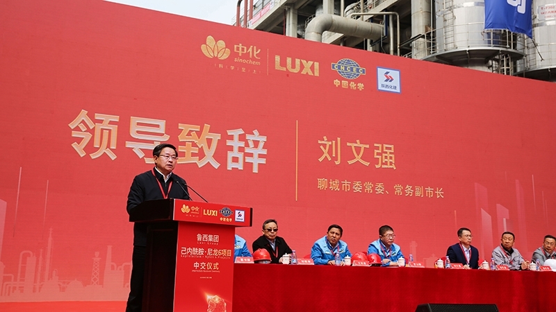 30万吨/年己内酰胺•尼龙6项目中交仪式在项目现场隆重举行。聊城市委常委、常务副市长刘文强,高新区党工委书记、管委会主任崔宪奎,公司党委书记、董事长王力刚,公司总经理、党委副书记王延吉,以及中国化学第六、十六公司等建设方负责人出席仪式。