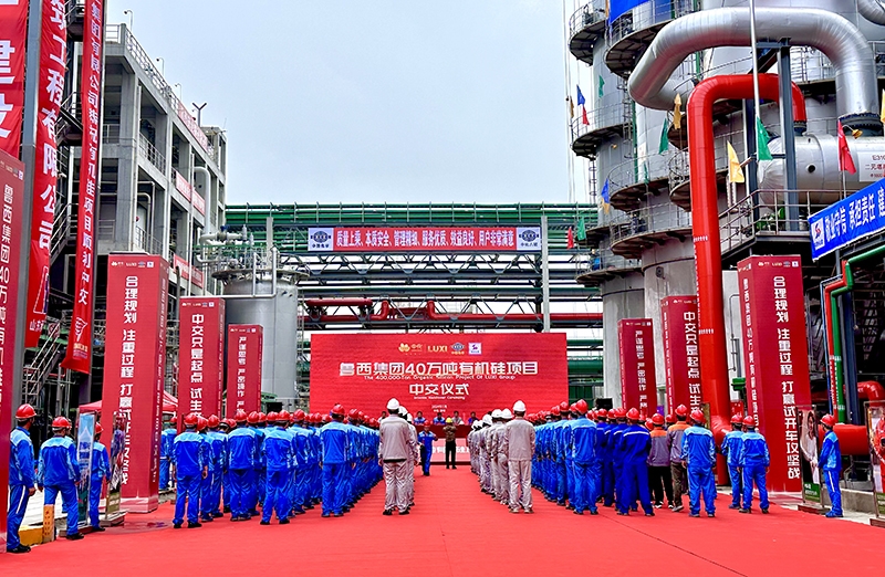 40万吨/年有机硅项目中交仪式在项目现场举行。公司总经理、党委副书记王延吉,党委副书记王富兴,高级副总经理董书国、张雷,中国化学第六公司、陕西化建、浙江华建、山东新鹏都等建设方负责人参加活动。
