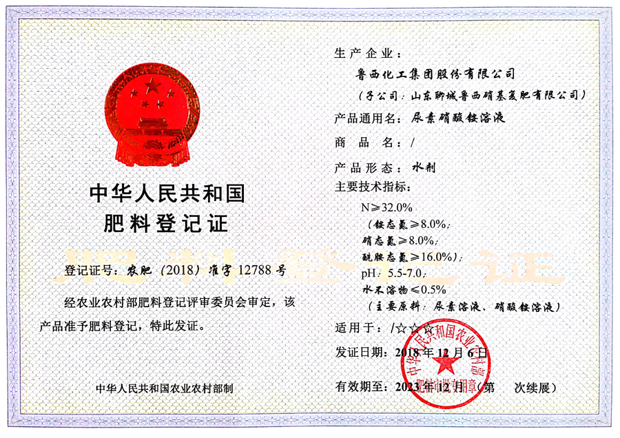 尿素硝酸铵溶液(32%)肥料登记证,登记证号为“农肥(2018)准字12788号”,登记证有效期5年。