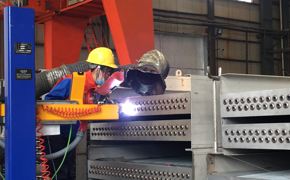 在设备制作现场,员工们正在热火朝天的忙碌着。有的在弯制蒸发冷管束,有的在焊接蒸发冷箱体,有的在焊接蒸发冷管箱管头……。记者现场采访了一名焊工孟丽娟,她告诉记者:“通过实施定量定价小段包工,我原来每天焊接蒸发冷管箱230个管头,现在焊接300个左右,工作效率明显提高了,工资收入增长了,干劲更足了。”