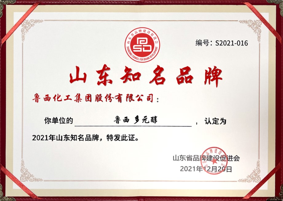 “多元醇”产品榜上有名,荣获“山东知名品牌”。